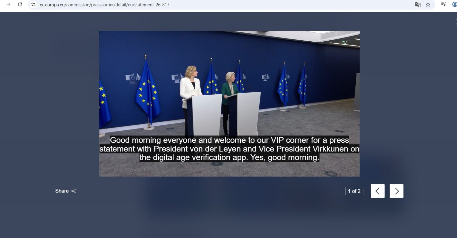„Нашето европейско приложение за проверка на възрастта (age verification app) е технически готово и скоро ще бъде достъпно за ползване от гражданите. Това приложение ще позволи на потребителите да докажат възрастта си, когато имат достъп до онлайн платформи. Точно както магазините изискват доказателство за възраст от хората, които купуват алкохолни напитки в магазин….